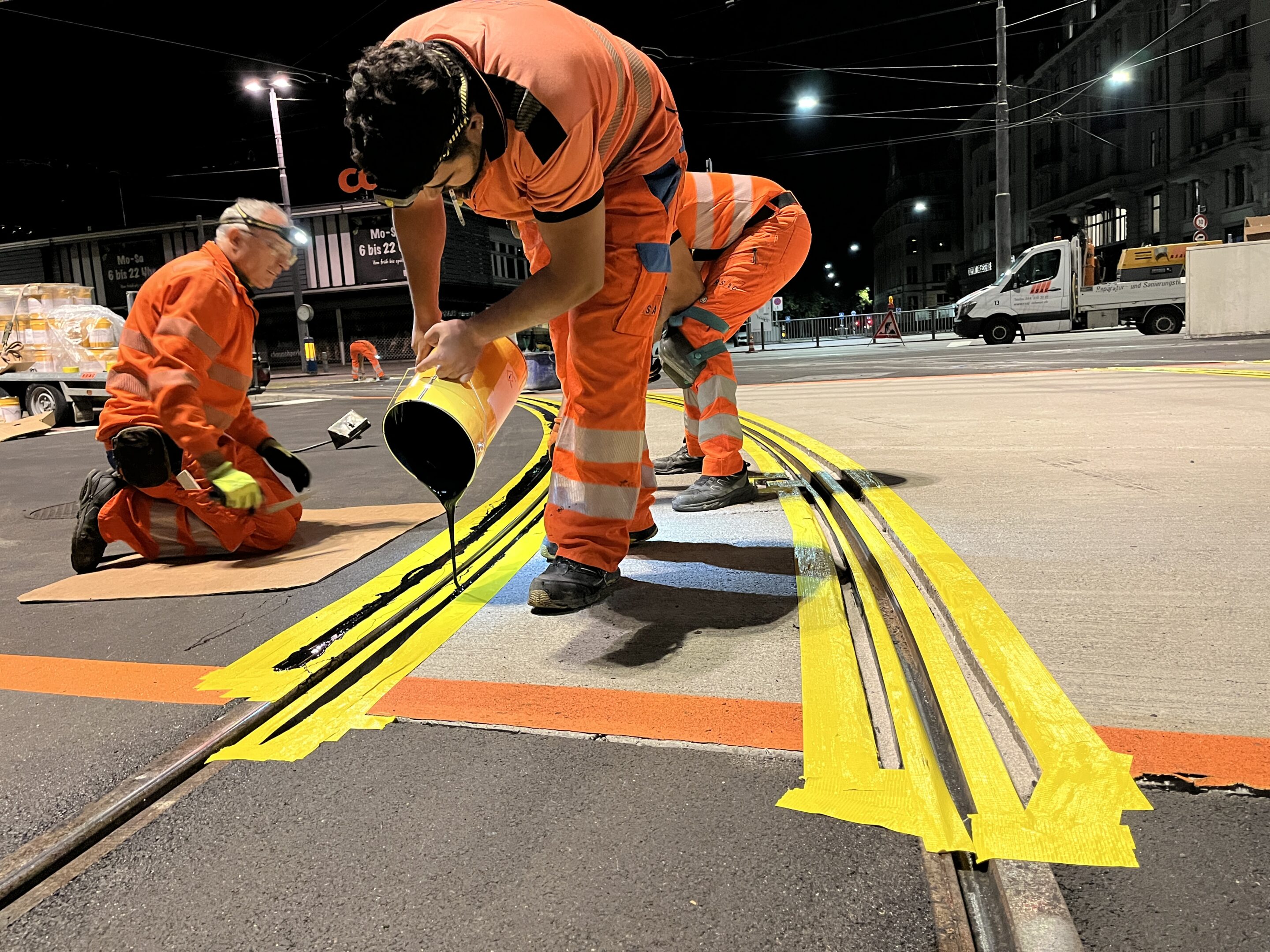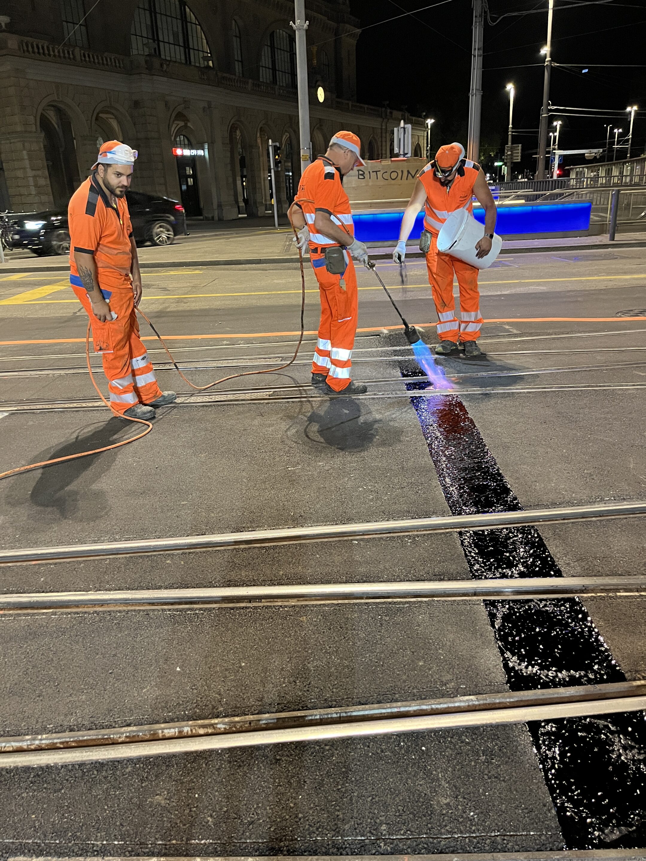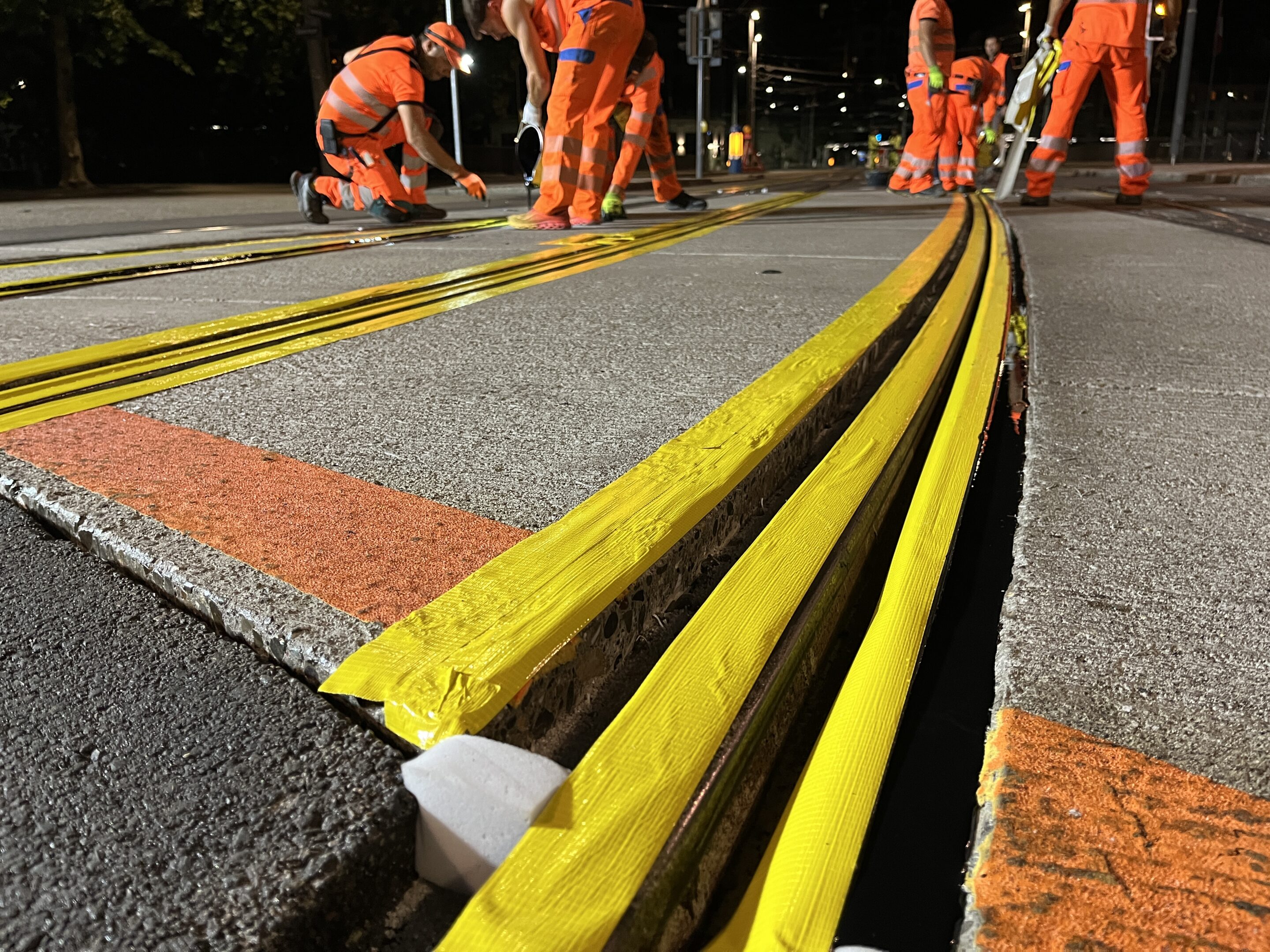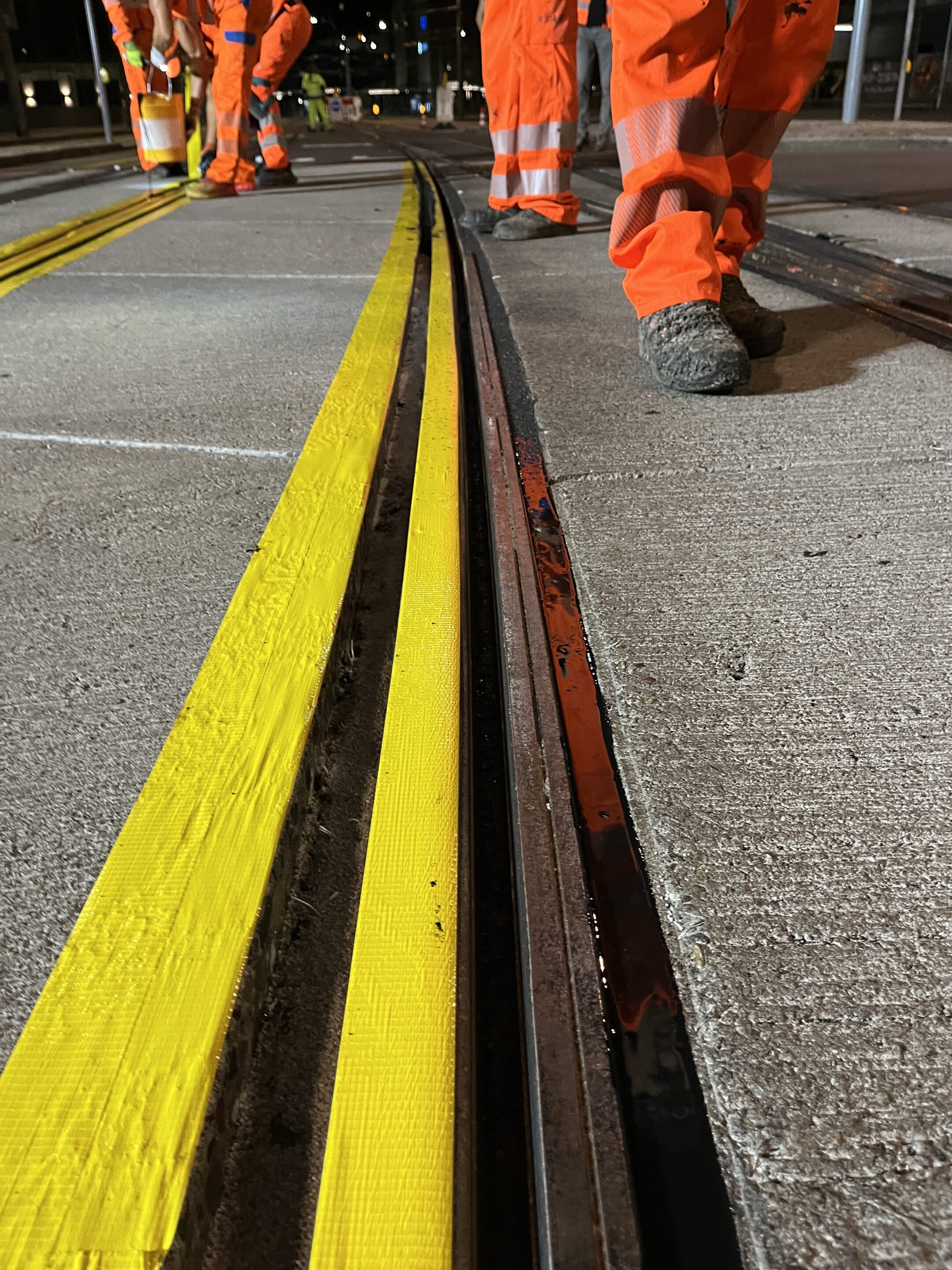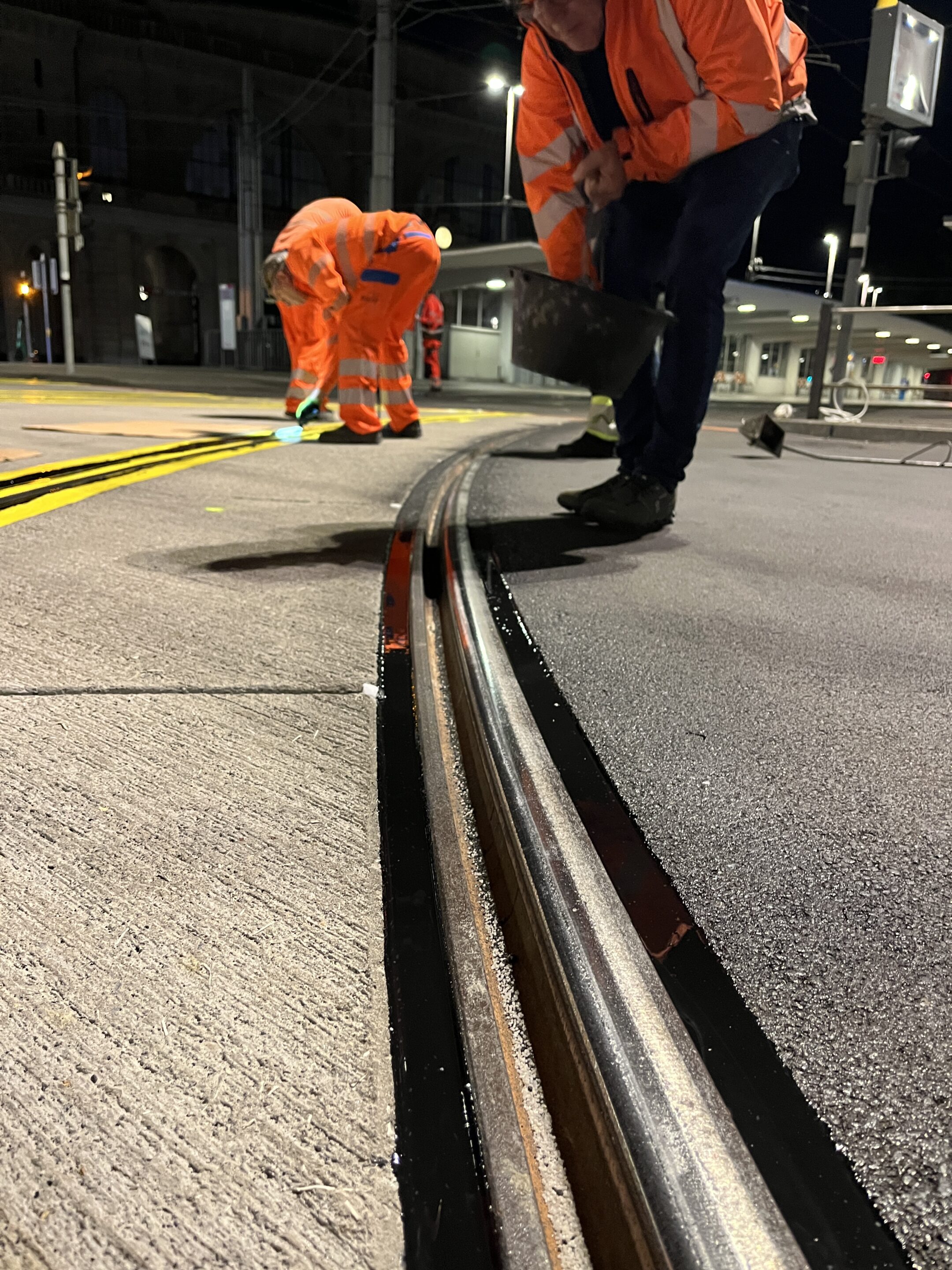Unser Team erstellte im Auftrag der KIBAG die Gleisfugen. Diese sind entscheidend, damit die Anlage sicher und funktionsfähig bleibt. Um den Trambetrieb und den Verkehr nicht zu tangieren, wurden die Arbeiten während der Nacht ausgeführt. Es wurden Schienenfugen im Kalt- und Heissvergussverfahren erstellt.