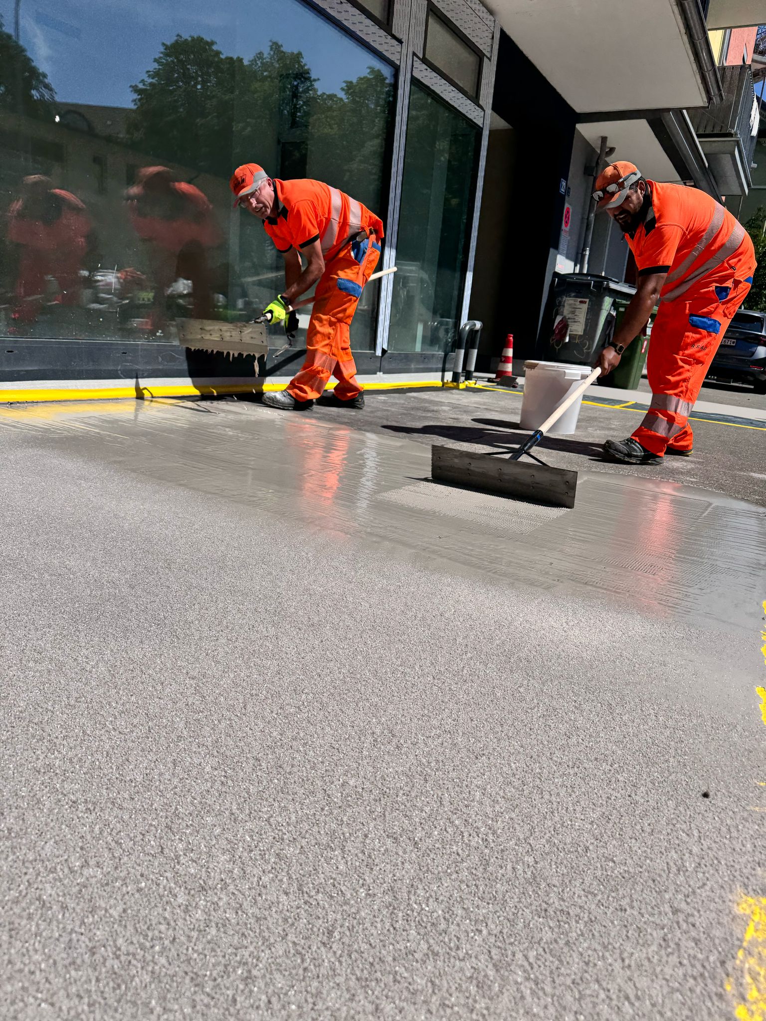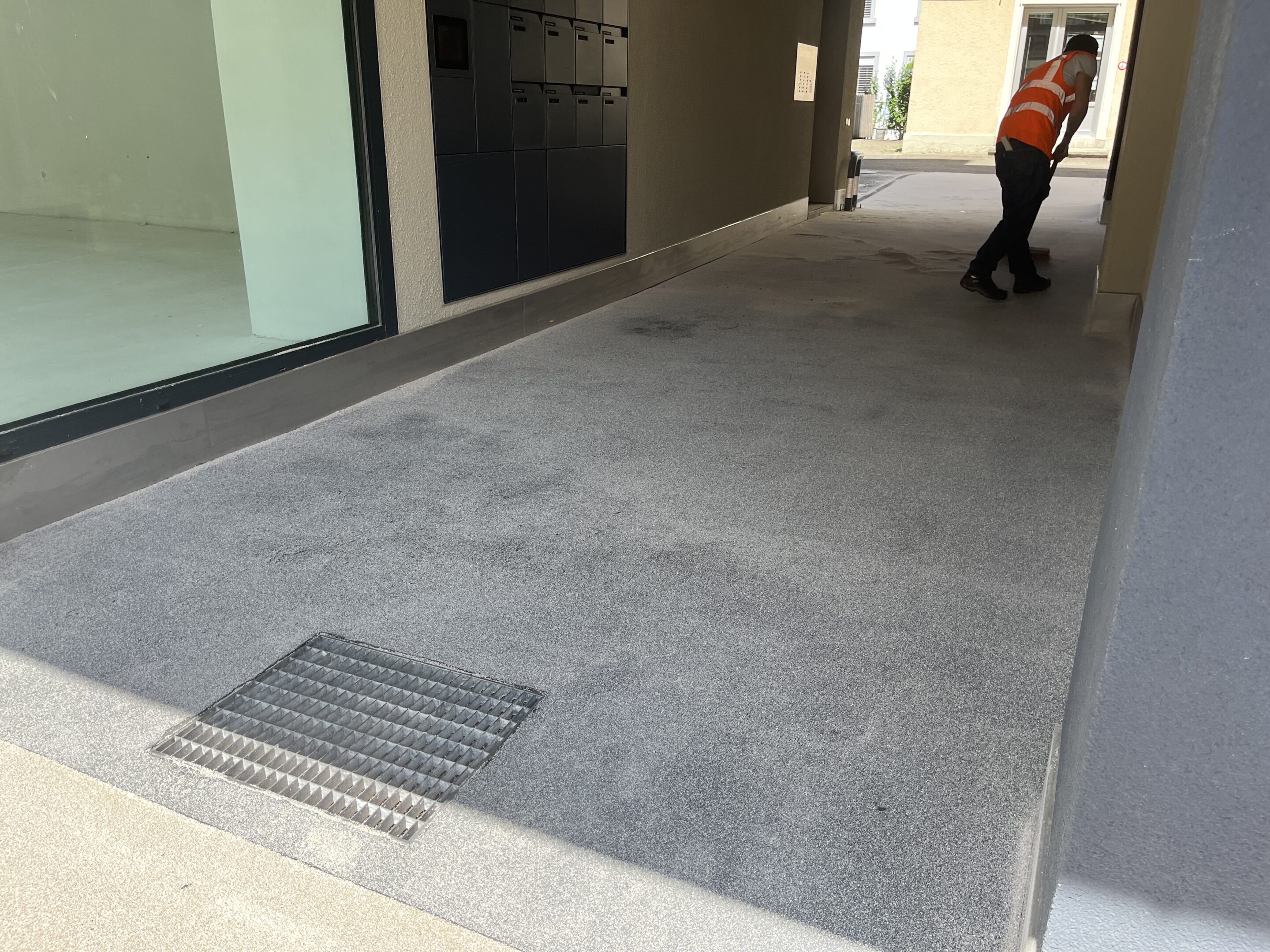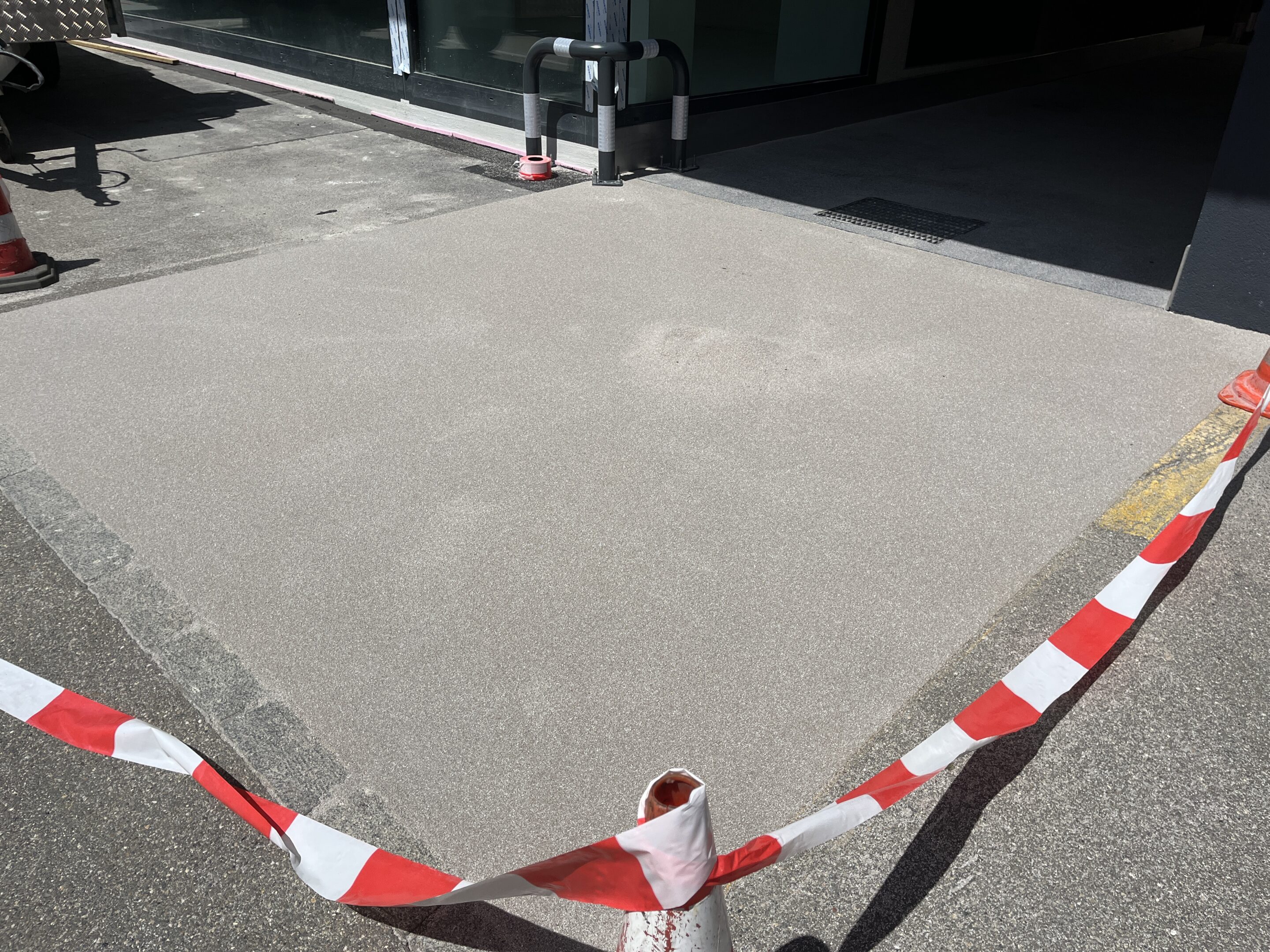 Unser Team hat einen Dünnschichtbelag aufgetragen mit unserem schnellaushärtenden Spezialmaterial auf PMMA-Basis. Die Oberfläche wurde in einem zweiten Arbeitsschritt mit Quarzsand abgestreut.