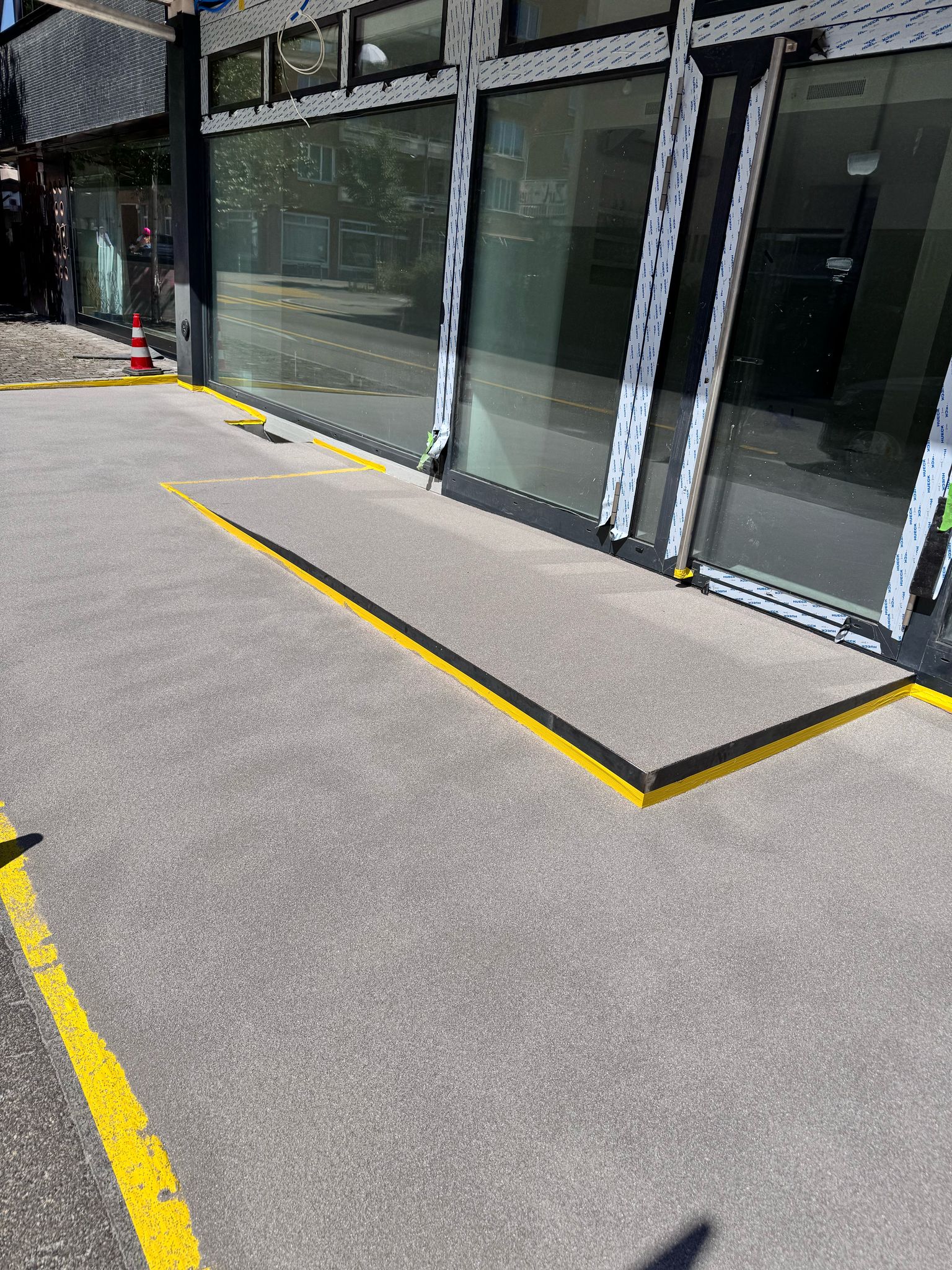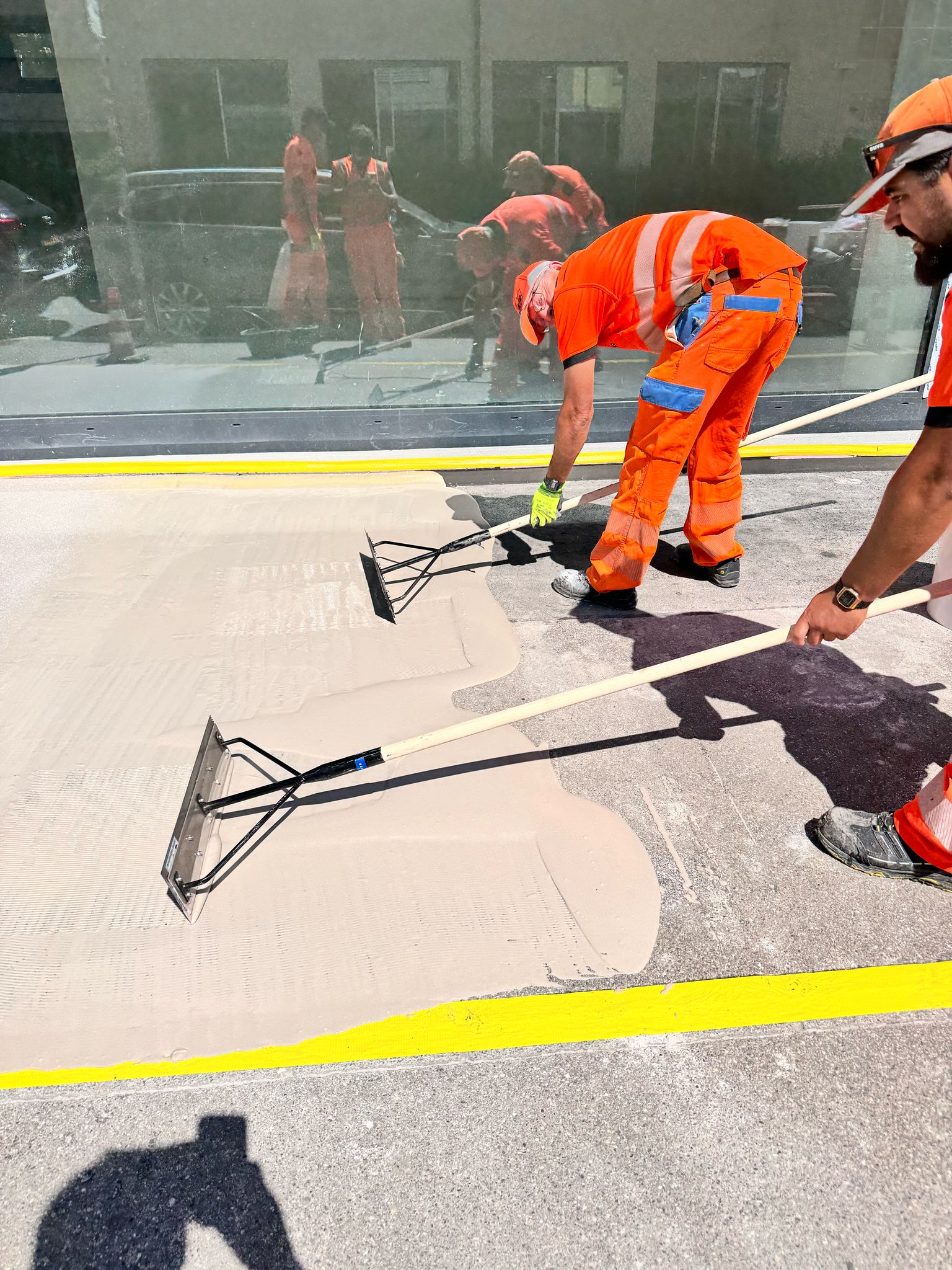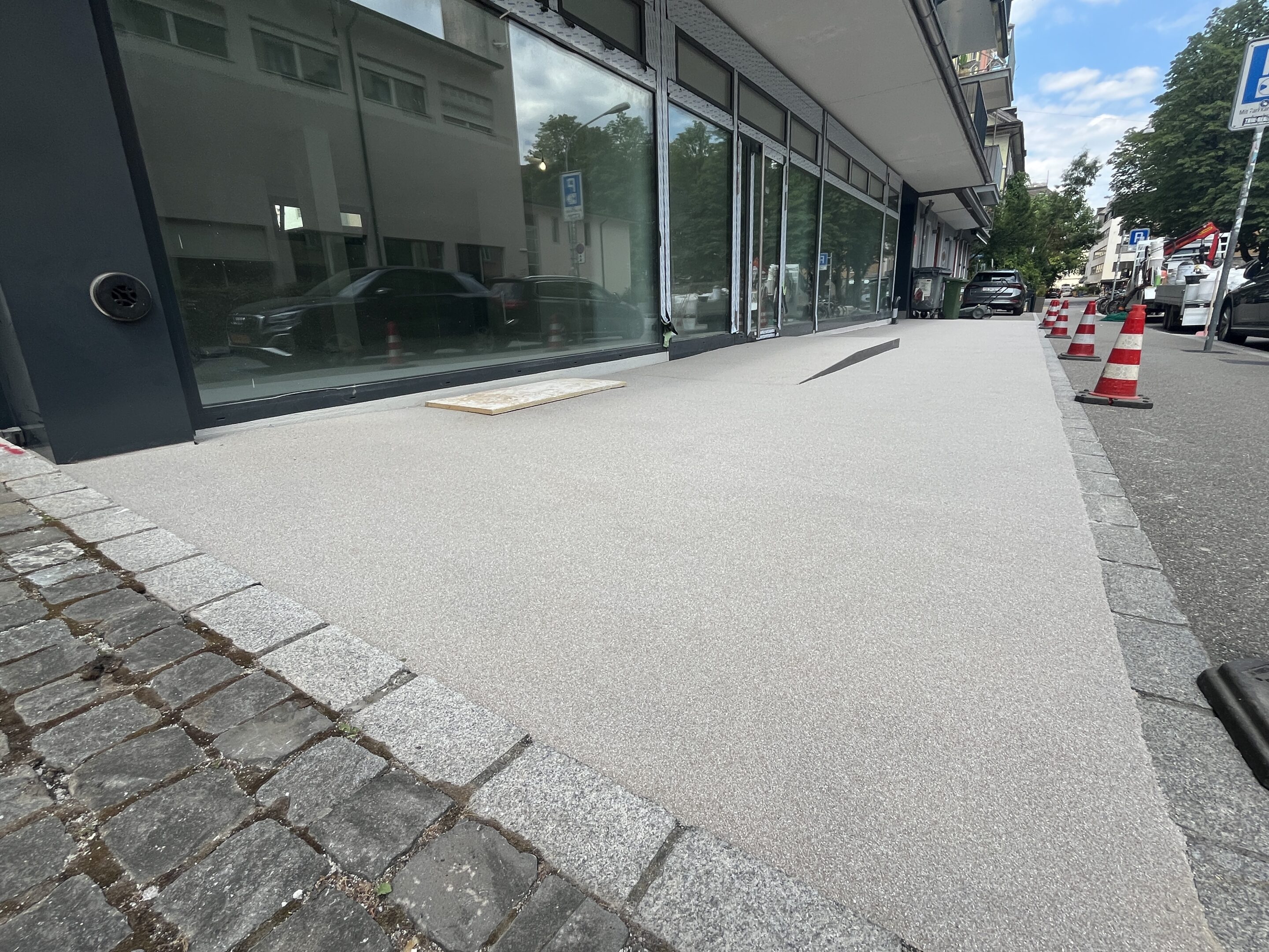 Unser Team hat einen Dünnschichtbelag aufgetragen mit unserem schnellaushärtenden Spezialmaterial auf PMMA-Basis. Die Oberfläche wurde in einem zweiten Arbeitsschritt mit Quarzsand abgestreut.